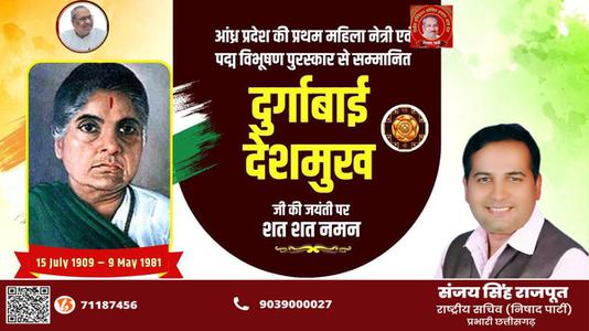 संजय सिंह राजपूत - स्वतंत्रता सेनानी दुर्गाबाई देशमुख जी की जयंती पर उन्हें कोटिश: नमन