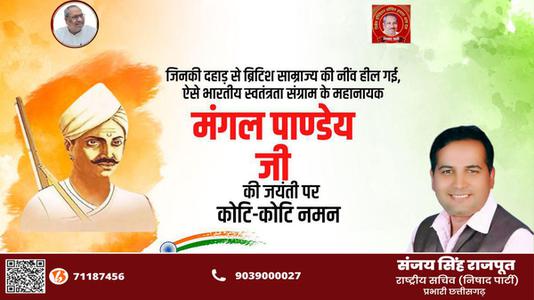 संजय सिंह राजपूत -भारतीय स्वतंत्रता क्रांति के अग्रदूत शहीद मंगल पांडे जी की जयंती पर उन्हें शत शत नमन